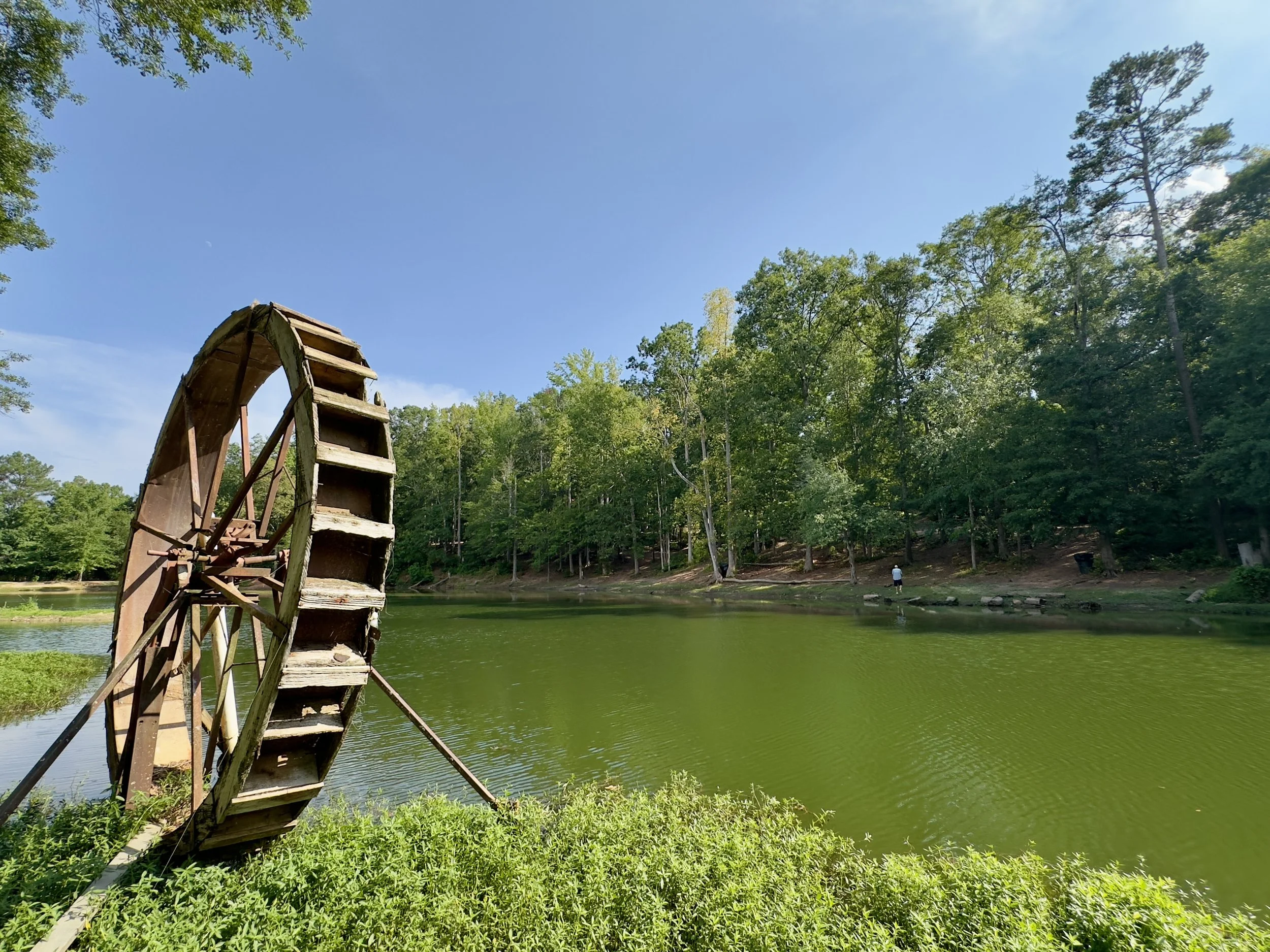 Old wooden waterwheel near green lake in a wooded area on a sunny day.
