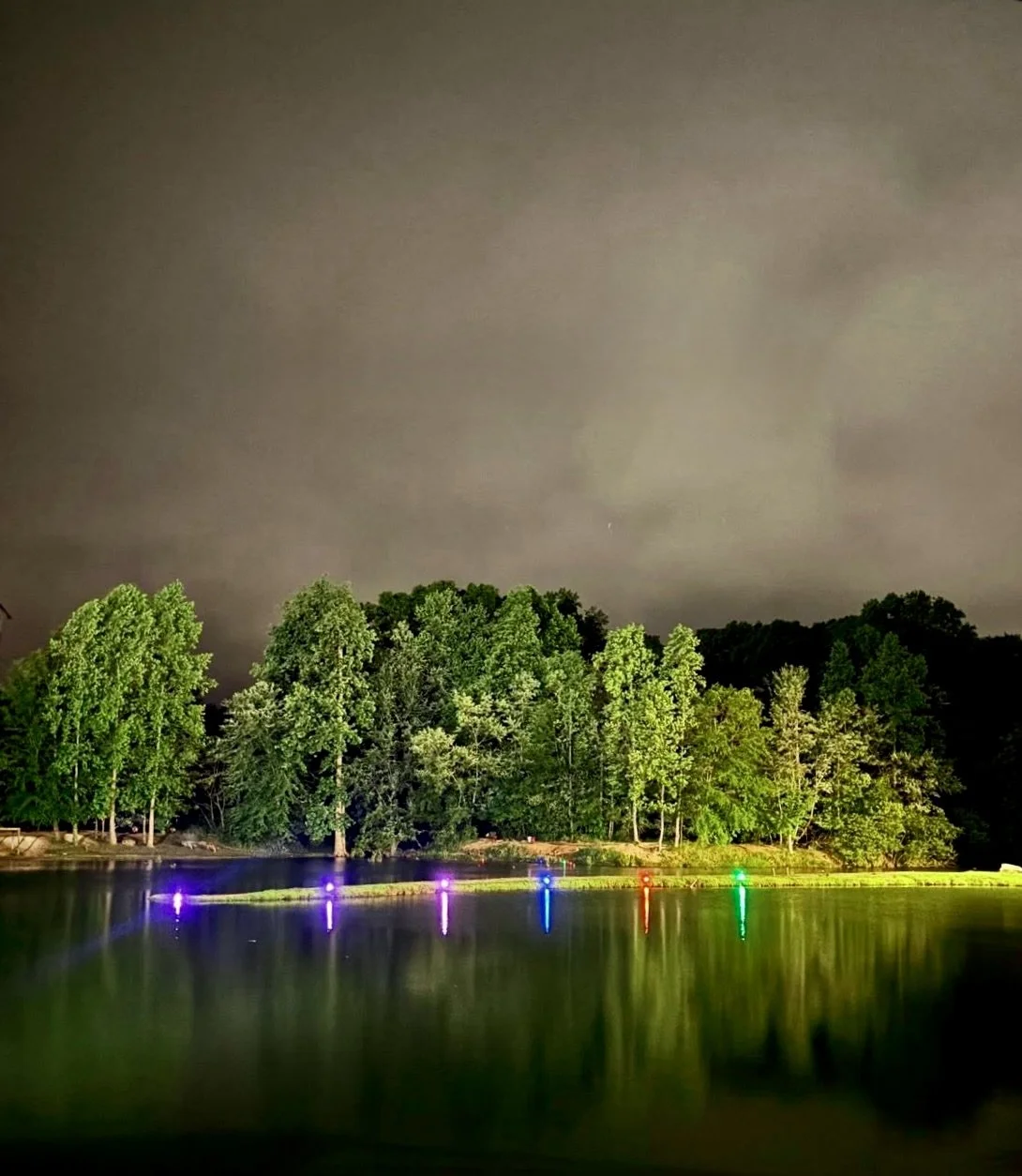 Night view of a lake with a line of trees along the shore, illuminated with colorful lights in purple, blue, red, and green, reflecting on the water, under a cloudy dark sky.